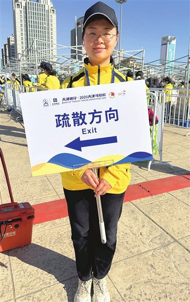 来自天津师范大学教育学部的大三学生简吉喆,是5900名志愿者中的一个,她在终点内场区域负责运动员疏散,简单说,她工作的范围,在物品发放区的后面。来自陕西的简吉喆说,在天津求学,非常高兴能有机会参与“天马”的志愿者工作,昨天她和同学们清晨五点半就集体从学校出发,根据之前的安排到各自负责的区域就位,因为自己负责疏散工作,除了举好手里的指示牌,还提前熟悉了整个终点区域的分布情况,随时应对大家的询问,另外在工作中也会观察选手们个人状态,随时准备提供帮助。